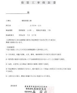 私どもはこのように考えているため、使用する塗料により異なりますが最長10年の保証を付けています。この期間中、問題が発生した場合は、電話1本でスグに伺い無料で補修いたします。
