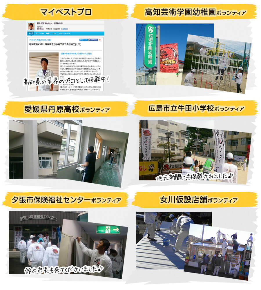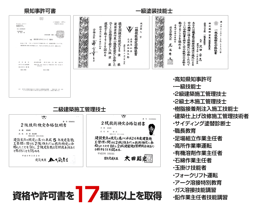 沢田塗装では、48年間で9,527棟を超える建物を塗装させていただきました。評価いただいているのはお客様だけではなく、高知市の入札業者に選ばれたり、同業者2社からの推薦がないと入れない高知県塗装工業会にも入会しています。