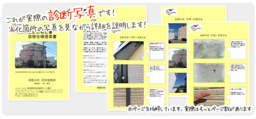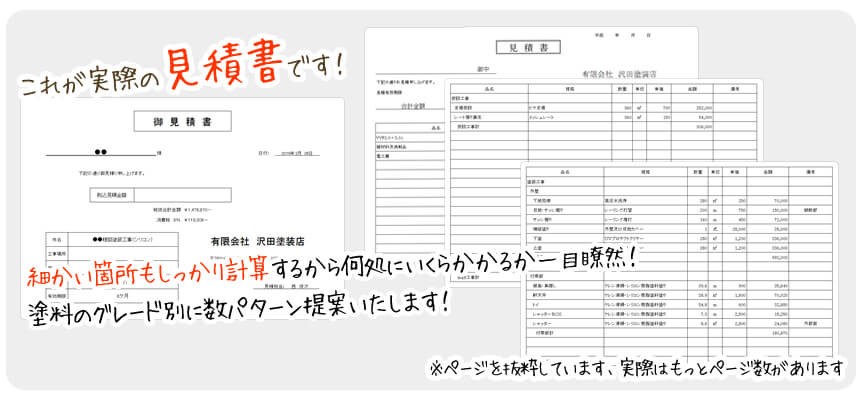 どのような塗料があるかわからないお客様も多いので、3~5パターンの見積書を作り、塗料別に特徴などをご説明させていただきます。