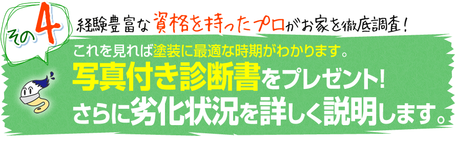 この診断は重要なので、代表の私自ら責任を持って行います。他社では、家の周りを簡単に見て10~20分で終わらす会社もありますが、私の場合はお客様の要望を聞く時間も入れると1時間前後になります。