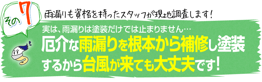私は塗装の仕事以外にも、鳶職などの建築関係の仕事の経験もあります。その経験から建物の構造に関する知識も身に付きました。構造の知識があるからこそ、雨漏りを止められます。