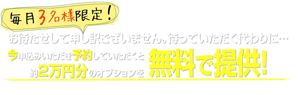 そのため、待っていただくお客様には謝罪の意味も込めまして、以下の人気オプション(通常約2万円)を無料にさせていただきます。