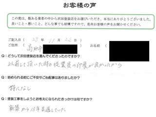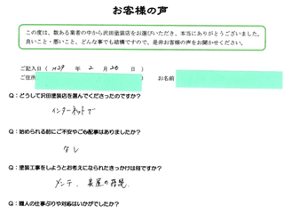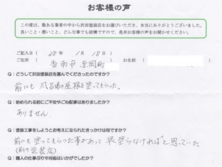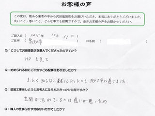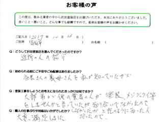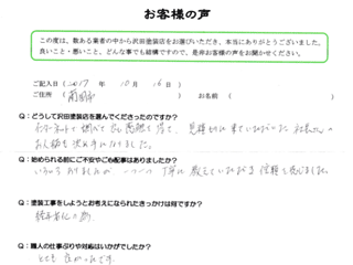 塗り替えの値段など皆目見当がつかなくて、見積書を見るまでは心配でしたが、西社長から見積りをもらい安心に変わりました。