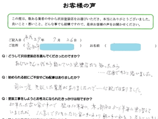 早く塗らなければと思っていたので安心した。暮れの忙しい時期に塗っていただいてありがとうございました。次回もよろしくお願いします。